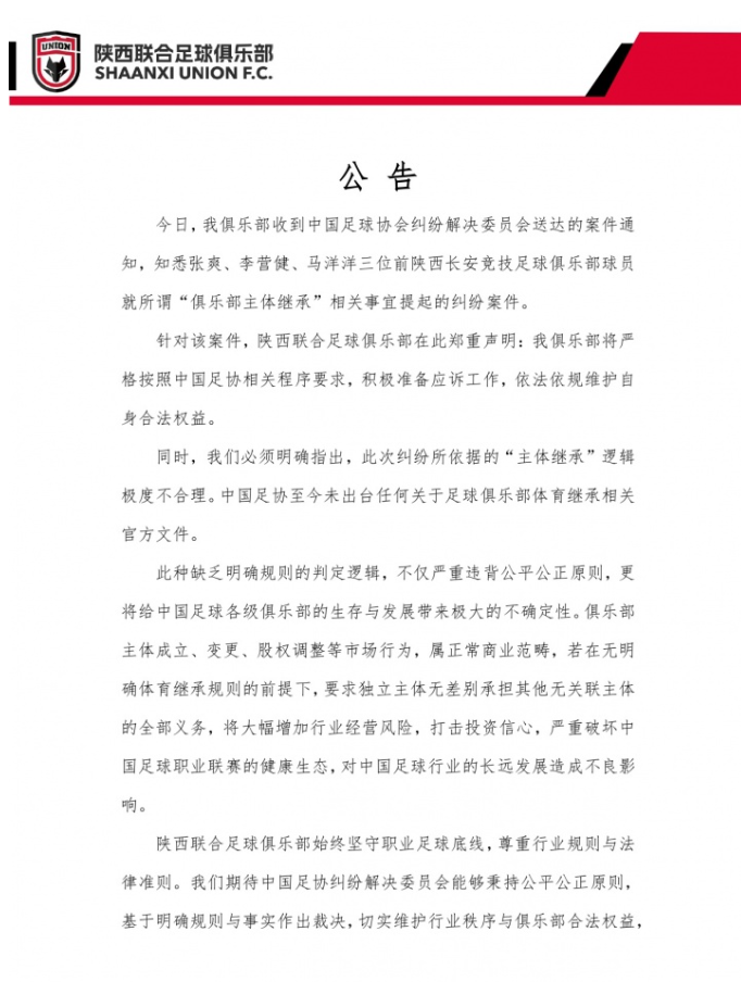當張爽、李營健、馬洋洋三名前陜西長安競技球員將陜西聯合告上中國足協時,這場圍繞 “俱樂部主體繼承” 的糾紛,不僅考驗著兩家俱樂部的權益邊界,更暴露了中國足球職業聯賽的規則真空。陜西聯合在公告中直言訴求 “邏輯極度不合理”,實則點破了當前行業治理的核心痛點。